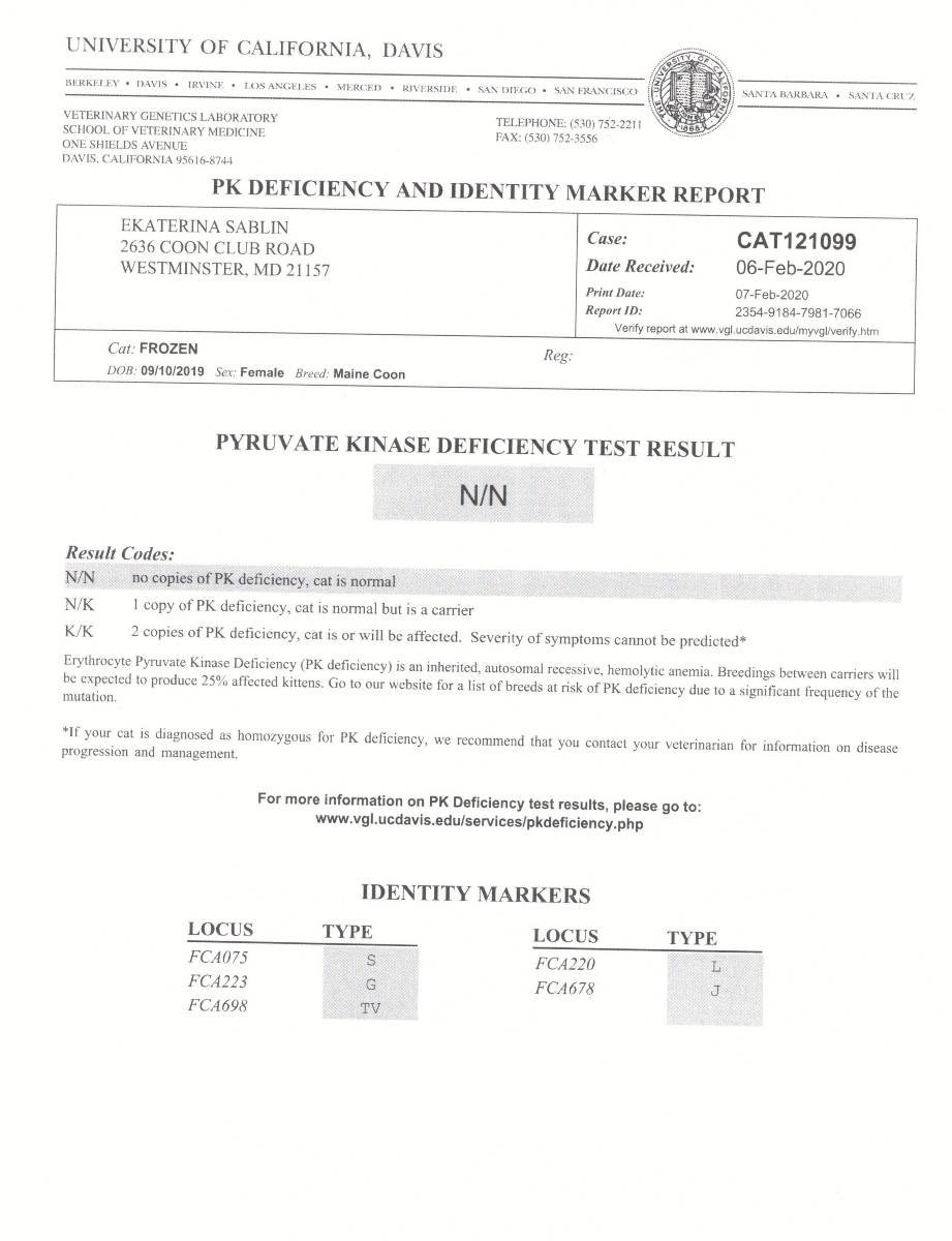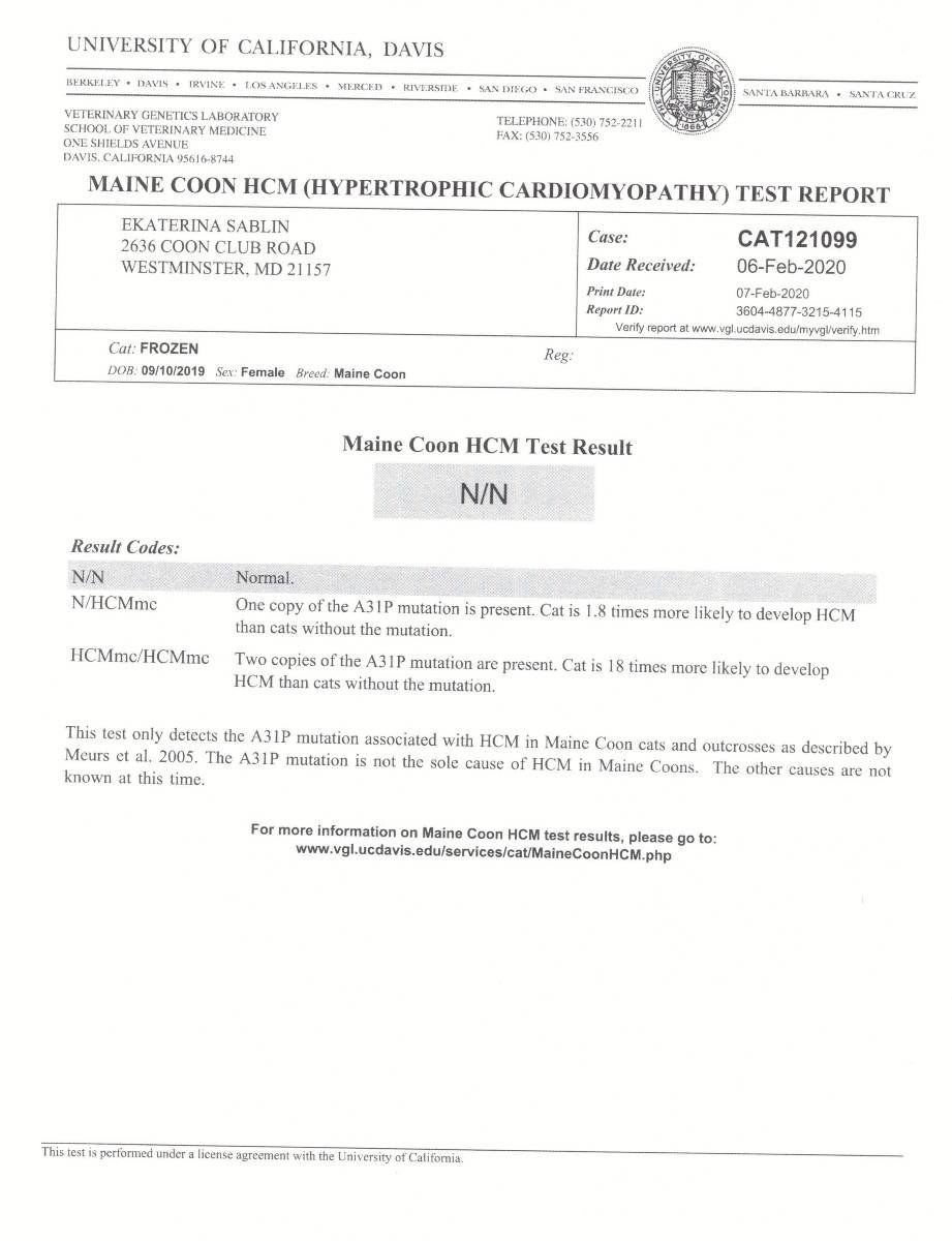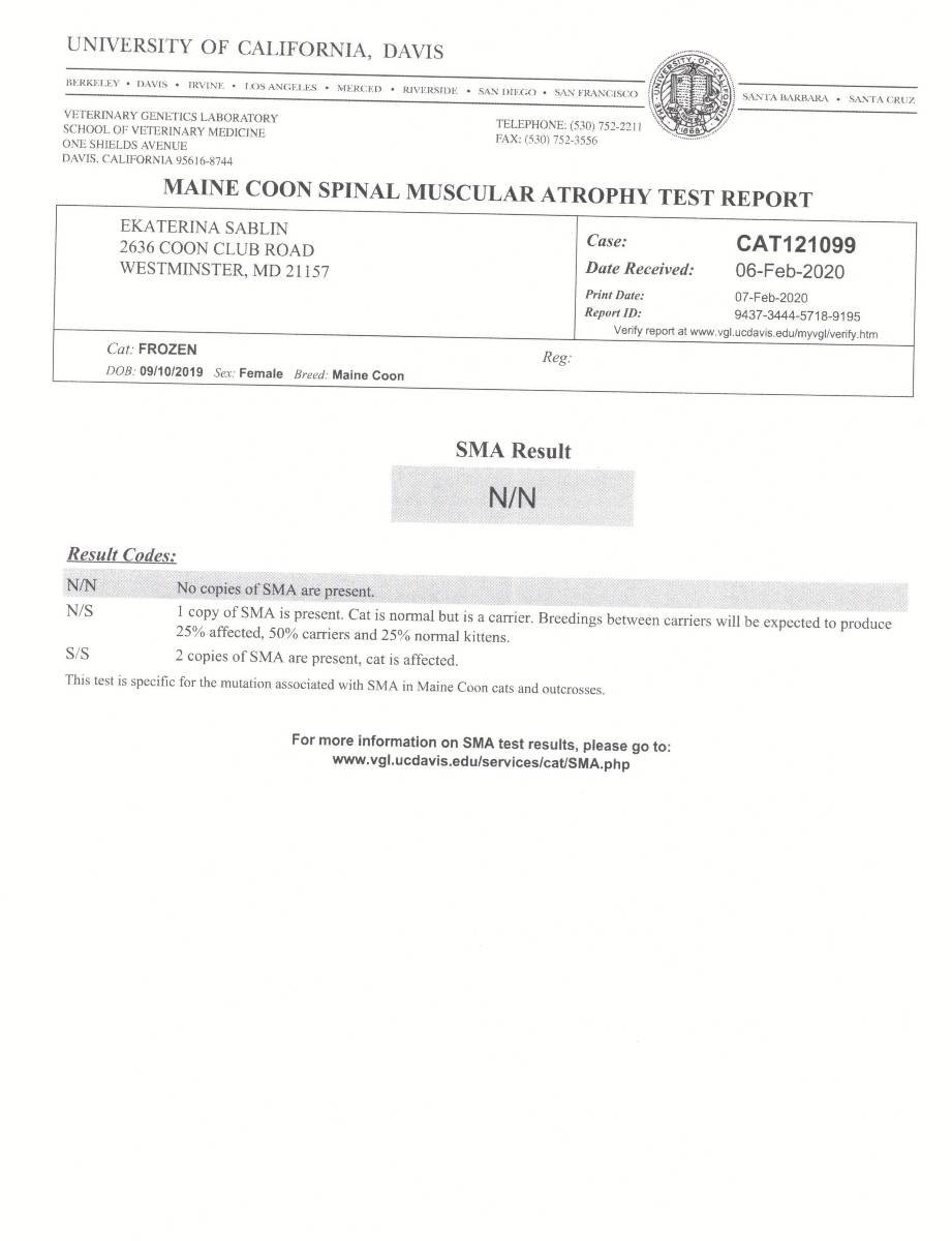 Each female Maine Coon cat is tested by us for carrying cats genetic diseases. Also you can see the photos and pedigree of our female Maine Coon cats.